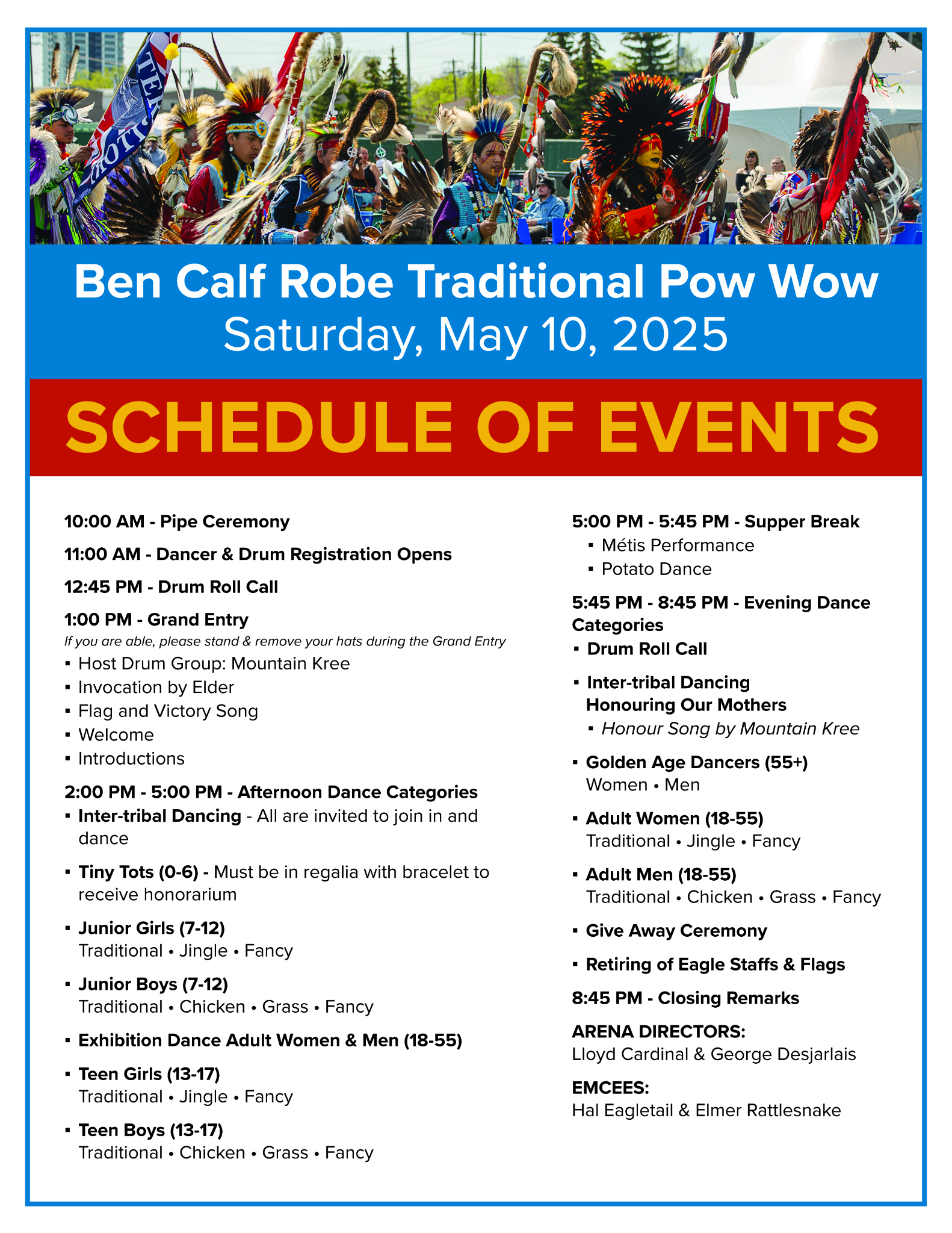 Please join us for the Ben Calf Robe Traditional Pow Wow on Saturday, May 10 at Commonwealth Community Recreation Centre (11000 Stadium Rd NW 2500, Edmonton) from 1:00 PM - 9:00 PM.
